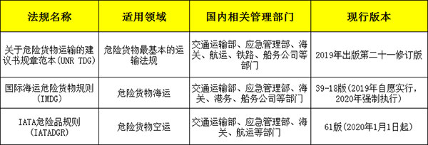 由于危險(xiǎn)貨物在運(yùn)輸過(guò)程中容易受到振動(dòng)、沖擊、撞擊、高溫、低溫、低壓等物理因素的影響,更容易使得其爆發(fā)出危險(xiǎn)性,對(duì)運(yùn)輸人員、運(yùn)輸工具、運(yùn)輸場(chǎng)所造成危害,因此,對(duì)于危險(xiǎn)貨物的運(yùn)輸需要苛刻的條件,如更加嚴(yán)格的包裝要求,滿足相應(yīng)的積載要求,向職能部門進(jìn)行申報(bào)并獲得批準(zhǔn)等。為了使得危險(xiǎn)貨物的運(yùn)輸更具有可操作性,國(guó)際上形成一系列的法律法規(guī)規(guī)定了危險(xiǎn)貨物的運(yùn)輸要求,國(guó)際上主要的危險(xiǎn)貨物運(yùn)輸法規(guī)如下: