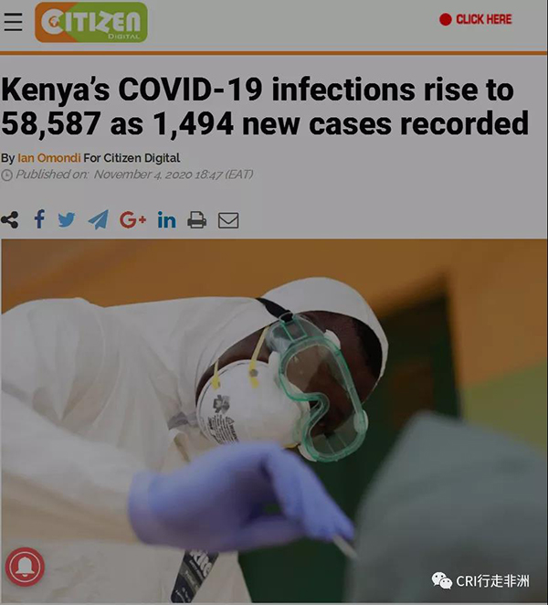 當(dāng)?shù)貢r間11月4日,肯尼亞衛(wèi)生部發(fā)布最新疫情通報稱,在過去24小時內(nèi)檢測了8839份樣本,新增1494例新冠肺炎確診病例,刷新單日新增紀(jì)錄,同時新增12例死亡和586例康復(fù),其中413人通過居家隔離護理自愈。截至目前肯尼亞累計檢測717172份樣本,累計確診58587例,死亡1051例,康復(fù)38381例,現(xiàn)存病例為19155例。