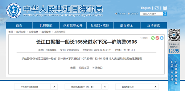 根據(jù)上海海事局14日發(fā)布消息,該船概位31-07.204N122-16.328E,請(qǐng)過(guò)往船舶注意搜救。