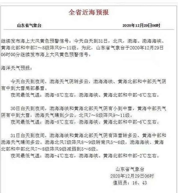 此外,山東省氣象臺(tái)發(fā)布海上大風(fēng)黃色預(yù)警,預(yù)報(bào)指出部分海域?qū)?huì)出現(xiàn)中到大雪,局部暴雪的氣象情況。
