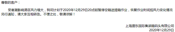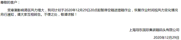受寒潮影響港區(qū)風(fēng)力增大,冠東盛東計(jì)劃于2020年12月29日20點(diǎn)起暫??障溥M(jìn)提箱作業(yè),恢復(fù)作業(yè)時(shí)間視風(fēng)力變化情況另行通知。
