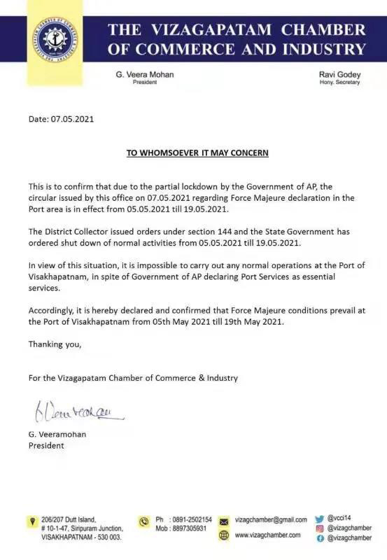 根據(jù)印度維沙卡帕特南商會發(fā)函表示:由于政府的封鎖,維沙卡帕特南港將于2021年5月5日至2021年5月19日關閉日常經營活動,特此宣布并確認維沙卡帕特南港從2021年5月1日到2021年5月19日存在不可抗力的情況。