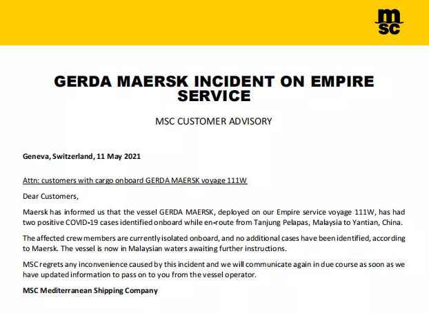 事發(fā)時(shí),“GERDA MAERSK”正在從馬來(lái)西亞Tanjung Pelapas駛往中國(guó)鹽田,據(jù)馬士基稱,受影響的船員目前在船上被隔離,尚未發(fā)現(xiàn)其他病例。目前該船仍在馬來(lái)西亞,具體等待時(shí)間有待通知。
