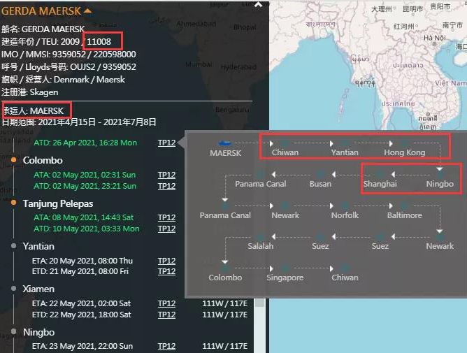 根據(jù)大船期資料顯示,集裝箱船“GERDA MAERSK”服務(wù)于知名的TP12航線,掛靠鹽田、香港、寧波、上海等國(guó)內(nèi)重要港口,目的港以紐約、巴爾的摩為主。