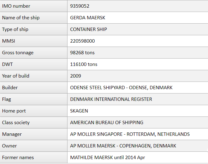GERDAMAERSK(IMO:9359052)是一艘集裝箱船,建于2009年(12年前),目前懸掛丹麥旗幟航行。