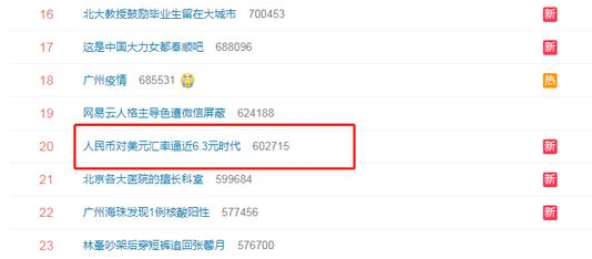 5月26日下午,#人民幣對美元匯率逼近6.3元時代#登上微博熱搜。
