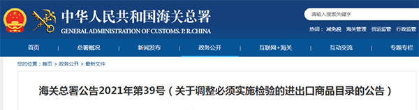2021年6月3日,海關(guān)總署發(fā)布2021年第39號公告,自2021年6月10日起,調(diào)整必須實施檢驗的進出口商品目錄。