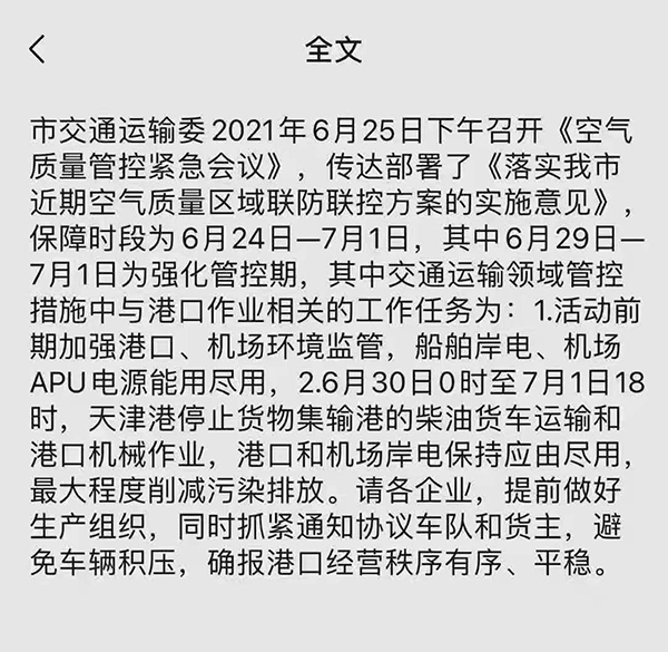 Ø 6月30日0時至7月1日18時,天津港停止貨物集輸港的柴油貨車運(yùn)輸和港口機(jī)械作業(yè),港口和機(jī)場岸電保持應(yīng)由盡用,最大程度削減污染排放。