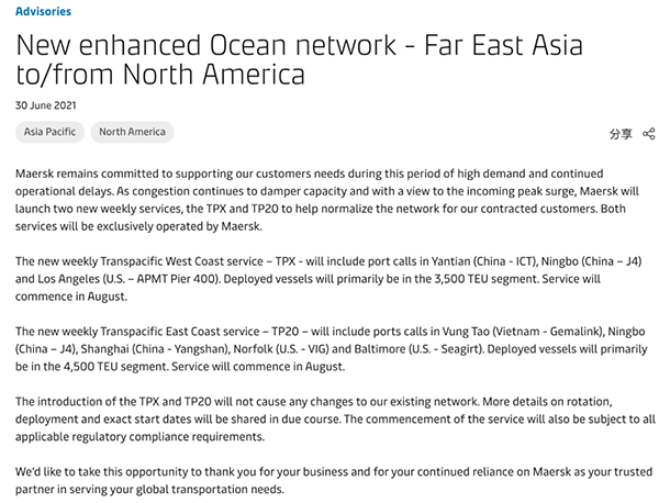 馬士基6月30日發(fā)布公告稱,由于近期持續(xù)擁堵降低了運(yùn)力可用性,同時(shí),運(yùn)輸旺季即將到來,為此,其推出兩條全新的跨太航線——TPX航線和TP20航線。