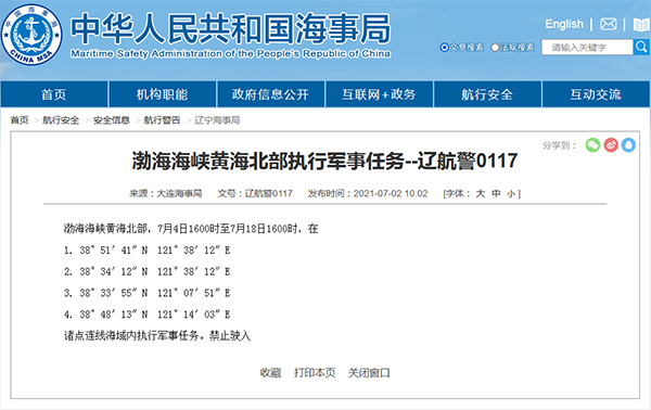 據(jù)遼寧海事局:渤海海峽黃海北部,7月4日1600時至7月18日1600時,在