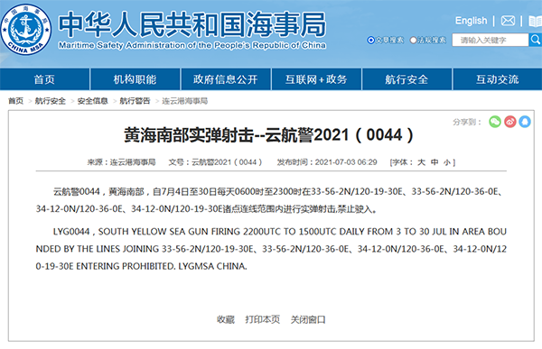 據(jù)連云港海事局:云航警0045,黃海中部,7月9日1200時至2400時在