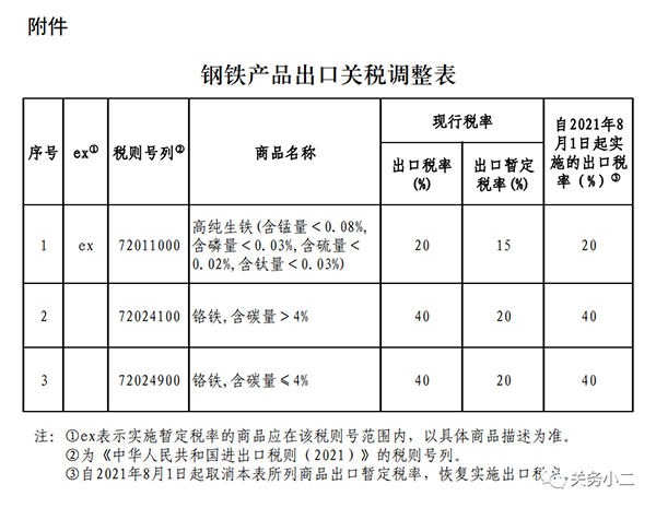 為促進鋼鐵行業(yè)轉型升級和高質量發(fā)展,經國務院批準,國務院關稅稅則委員會發(fā)布公告,自202181日起,適當提高鉻鐵、高純生鐵的出口關稅,調整后分別實行40%20%的出口稅率。