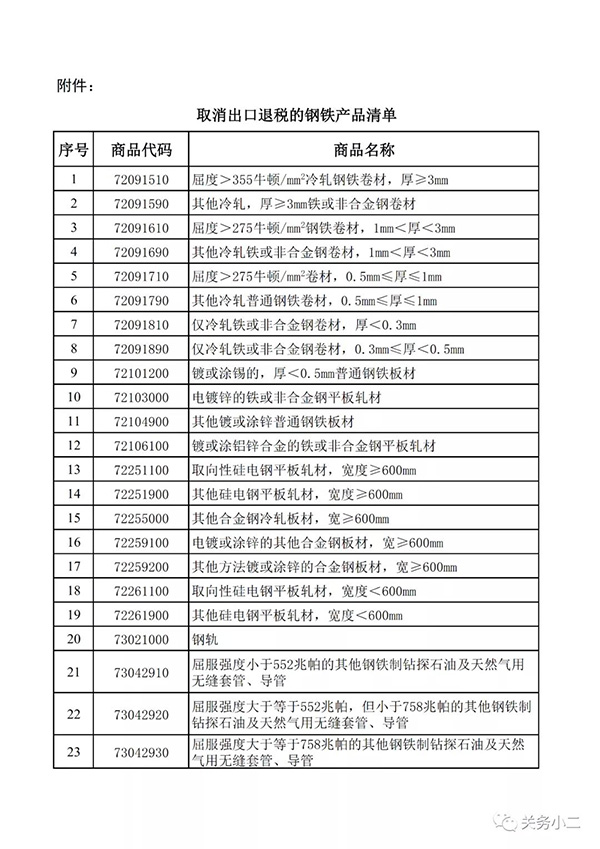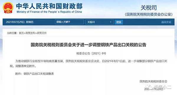202151日起部分鋼鐵產品調整關稅及取消出口退稅后,財政部日前發(fā)布公告,自202181日起進一步調整部分鋼鐵產品出口關稅和取消部分鋼鐵產品出口退稅。