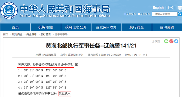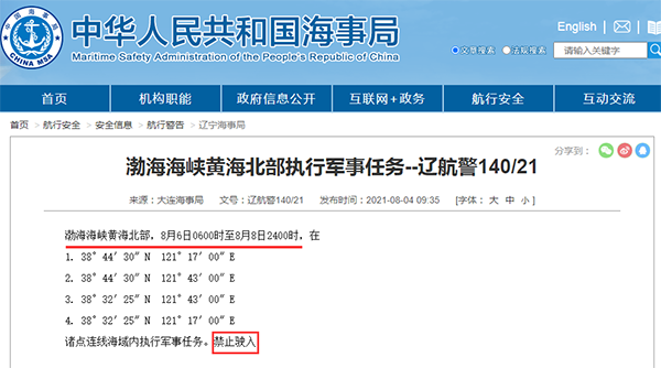 據(jù)大連海事局:渤海海峽黃海北部,8月6日0600時至8月8日2400時,在