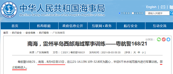 據(jù)廣東海事局:粵航警168/21,南海,8月4日至13日,在以21-14.13N 109-32.80E為圓心,半徑6千米水域范圍內(nèi)進行軍事訓(xùn)練。禁止船舶進入。