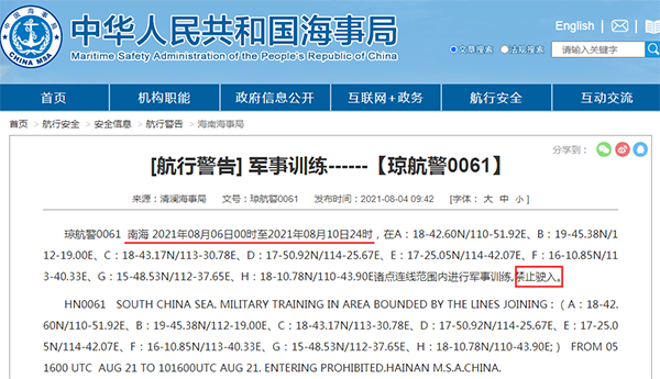 據(jù)海南海事局:瓊航警0061,南海 2021年08月06日00時至2021年08月10日24時,在
