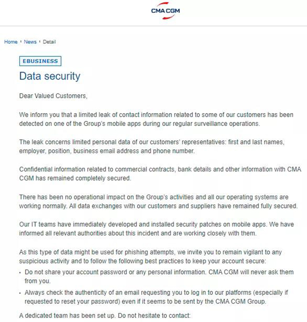 剛剛,法國(guó)集裝箱運(yùn)輸公司CMA CGM發(fā)布客戶通知書,確認(rèn)其再次遭到了網(wǎng)絡(luò)襲擊,并表示部分客戶信息遭泄露。 CMACGM在通知中寫到:“我們希望能通知到您,在我們對(duì)集團(tuán)api(應(yīng)用程序編程接口)的監(jiān)控行動(dòng)中,發(fā)現(xiàn)部分客戶信息(包括姓名、雇主、職位、電子郵件地址和電話號(hào)碼)的數(shù)據(jù)泄漏。”
