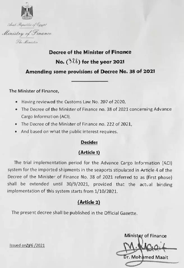 埃及即將于10月1日開(kāi)始強(qiáng)制實(shí)施 “Advanced Cargo Information (ACI) declaration”預(yù)報(bào)貨物。資料規(guī)定,所有進(jìn)口的貨物,收貨人必須先行在當(dāng)?shù)叵到y(tǒng)預(yù)報(bào)貨物資料以獲取ACID號(hào)碼,提供給發(fā)貨人。