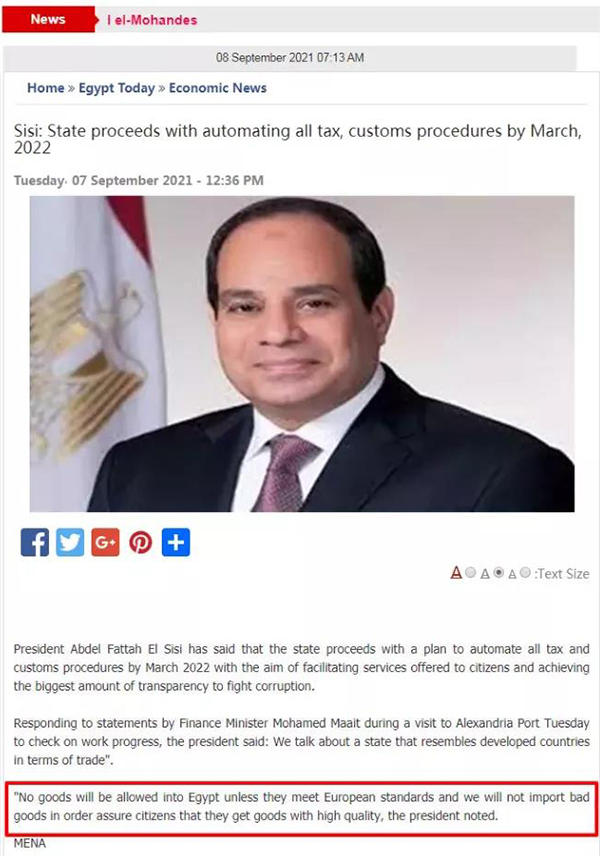埃及總統(tǒng)阿卜杜勒-法塔赫·塞西放話說(shuō):“只有符合歐洲標(biāo)準(zhǔn)的貨物才可以進(jìn)口到埃及,我們絕不進(jìn)口劣質(zhì)貨物,以確保公民獲得高質(zhì)量的貨物。”