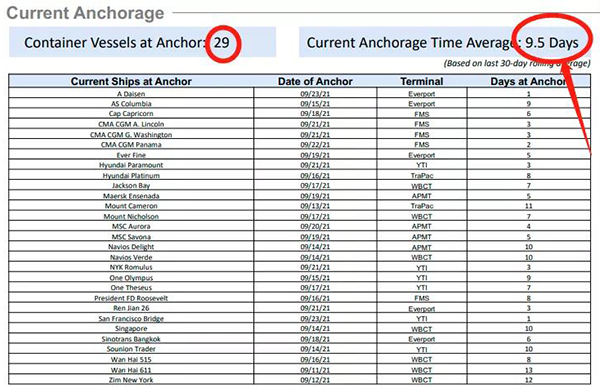 而據(jù)洛杉磯港signal平臺(tái)24日的最新數(shù)據(jù),目前光在洛杉磯錨地等待泊位的集裝箱船就達(dá)到29艘,在港外等待的船舶更是達(dá)到14艘,等待的船舶共達(dá)到43艘,平均等待靠泊時(shí)間由3天前的9.0天激增至9.5天。