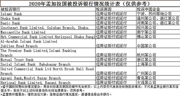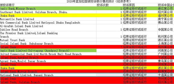 我國駐孟加拉國大使館經(jīng)濟(jì)商務(wù)參贊處在今年4月曾發(fā)布了一張《2020年孟加拉國商業(yè)銀行被投訴情況統(tǒng)計(jì)表》: