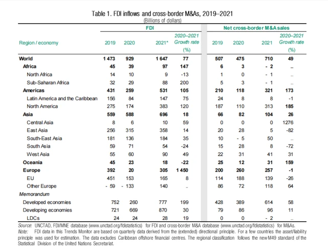 根據(jù)聯(lián)合國(guó)貿(mào)發(fā)會(huì)議發(fā)布數(shù)據(jù),2021年,全球外國(guó)直接投資(FDI)流量出現(xiàn)強(qiáng)勁反彈,從2020年的9290億美元增長(zhǎng)到1.65萬(wàn)億美元,同比增長(zhǎng)77%,超過了新冠疫情爆發(fā)前(2019年的1.47萬(wàn)億美元)的水平。
