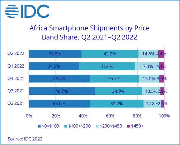 如果從價格來看,在第二季度,非洲智能手機的平均銷售價格則下降了3%左右。其中,價格在100美元到200美元的手機,最受到消費者的喜愛,份額達到了42.2%。其次則是價格在100美元以下的手機產(chǎn)品,選擇這個價位手機的消費者有38.8%。此外,選擇價格在200美元到450美元手機的消費者有14.6%,450美元以上的則有4.4%。