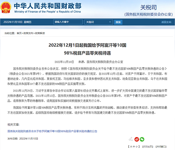 國務(wù)院關(guān)稅稅則委員會發(fā)布公告決定,按照《國務(wù)院關(guān)稅稅則委員會關(guān)于給予最不發(fā)達國家98%稅目產(chǎn)品零關(guān)稅待遇的公告》(稅委會公告2021年第8號),根據(jù)我國政府與有關(guān)國家政府的換文規(guī)定,自2022年12月1日起,對原產(chǎn)于阿富汗、貝寧共和國、布基納法索、幾內(nèi)亞比紹共和國、萊索托王國、馬拉維共和國、圣多美和普林西比民主共和國、坦桑尼亞聯(lián)合共和國、烏干達共和國和贊比亞共和國等10個最不發(fā)達國家的98%稅目產(chǎn)品實施零關(guān)稅。