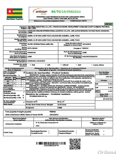 喀麥隆ECTN規(guī)定:根據(jù)喀麥隆共和國法令,所有發(fā)貨至喀麥隆港口的貨物都必須申請(qǐng)電子貨物跟蹤單BSC(ECTN)。ECTN是英文:ELECTRONIC CARGO TRACKING NOTE的縮寫。也有成為BESC,是法語BORDEREAU DE CARGAISON的縮寫。